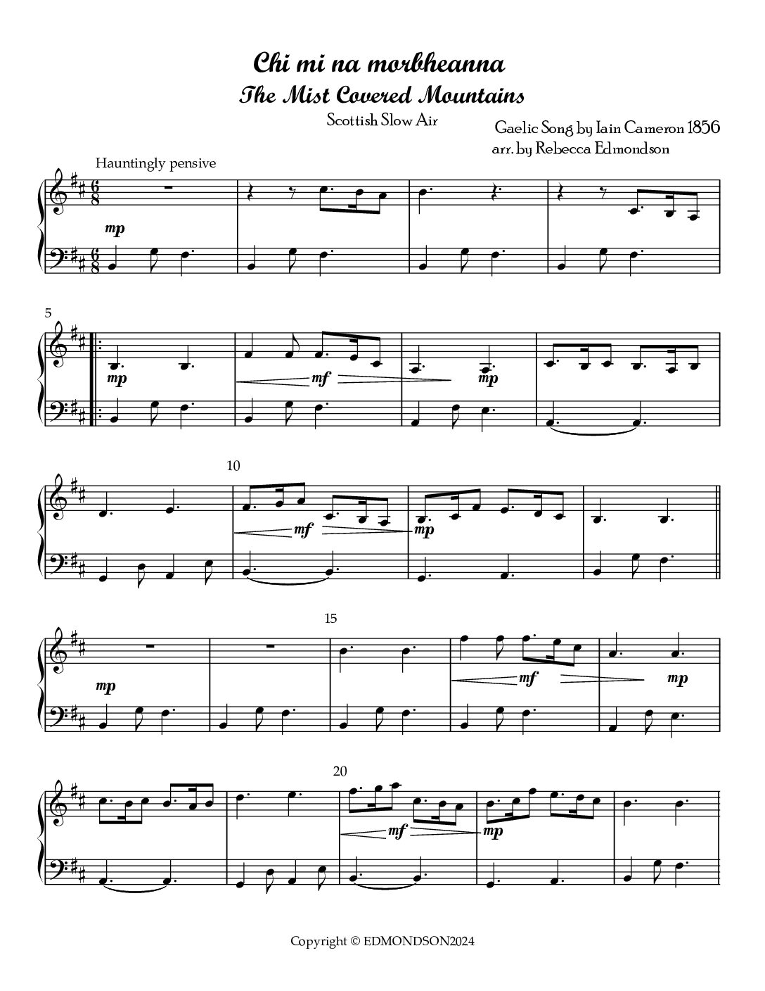 Chi mi na morbheanna, or The Mist Covered Mountains, is a Scottish Gaelic song written as a farewell to the Highlands by Iain Cameron in 1856. The melody is timeless and haunting with its wistful rise and fall of the recurring motif as it emulates the rise and fall of the mountain terrain and a longing for home. Intermediate Lever, 4 pages