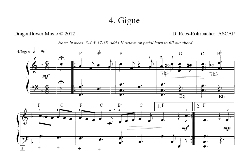 “This collection of four dances is reminiscent of the classic Baroque dance suite – with a contemporary touch – arranged for lever and pedal harps.  It is designed primarily for recital, background or wedding use. However, it may be used to accompany actual dancing by repeating each selection several times.  Chord symbols are provided so that the right-hand melody may be played by any ‘C’ instrument accompanied by harp, lute, guitar or keyboard.