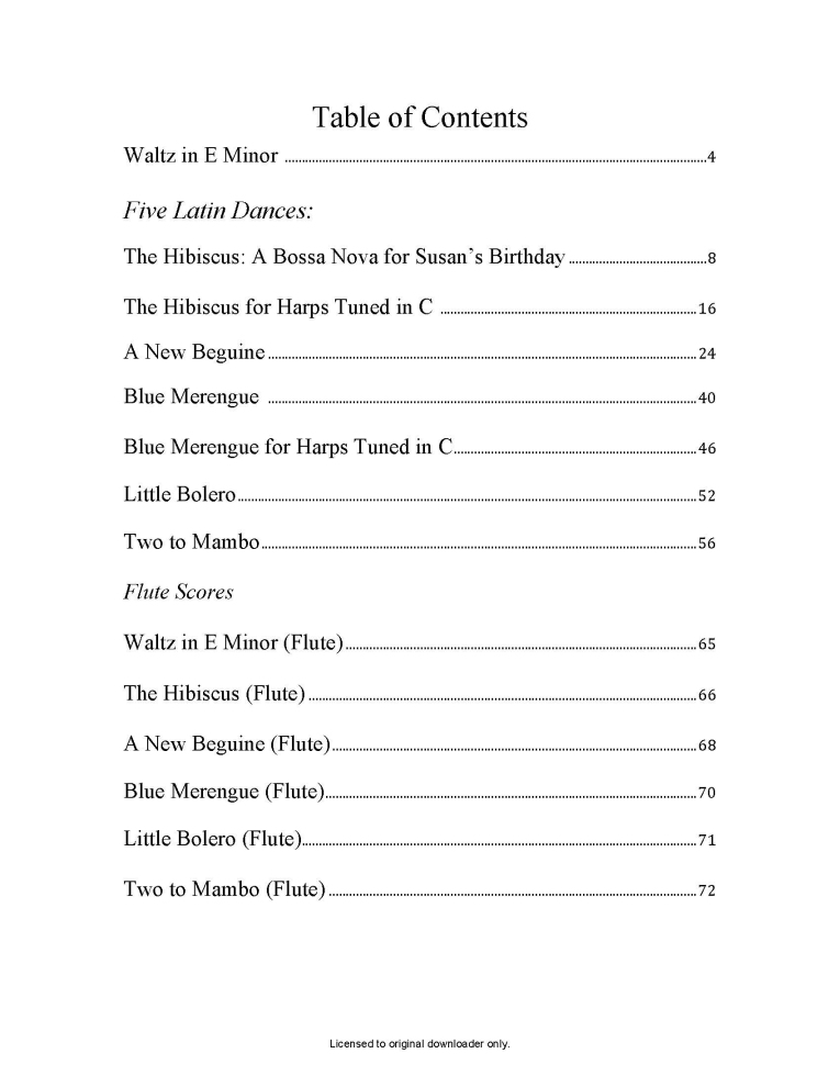 Five really fun Latin Dances!   The percussion parts are optional, but they do make the pieces a lot more fun.  Where fingering is given in the harp parts, numbers above the notes are for the right hand, and numbers below the notes are for the left hand. Your purchase options for this title are 1-book alone | 2-book with CD |  3-digital book alone |  4-digital book with Mp3 files