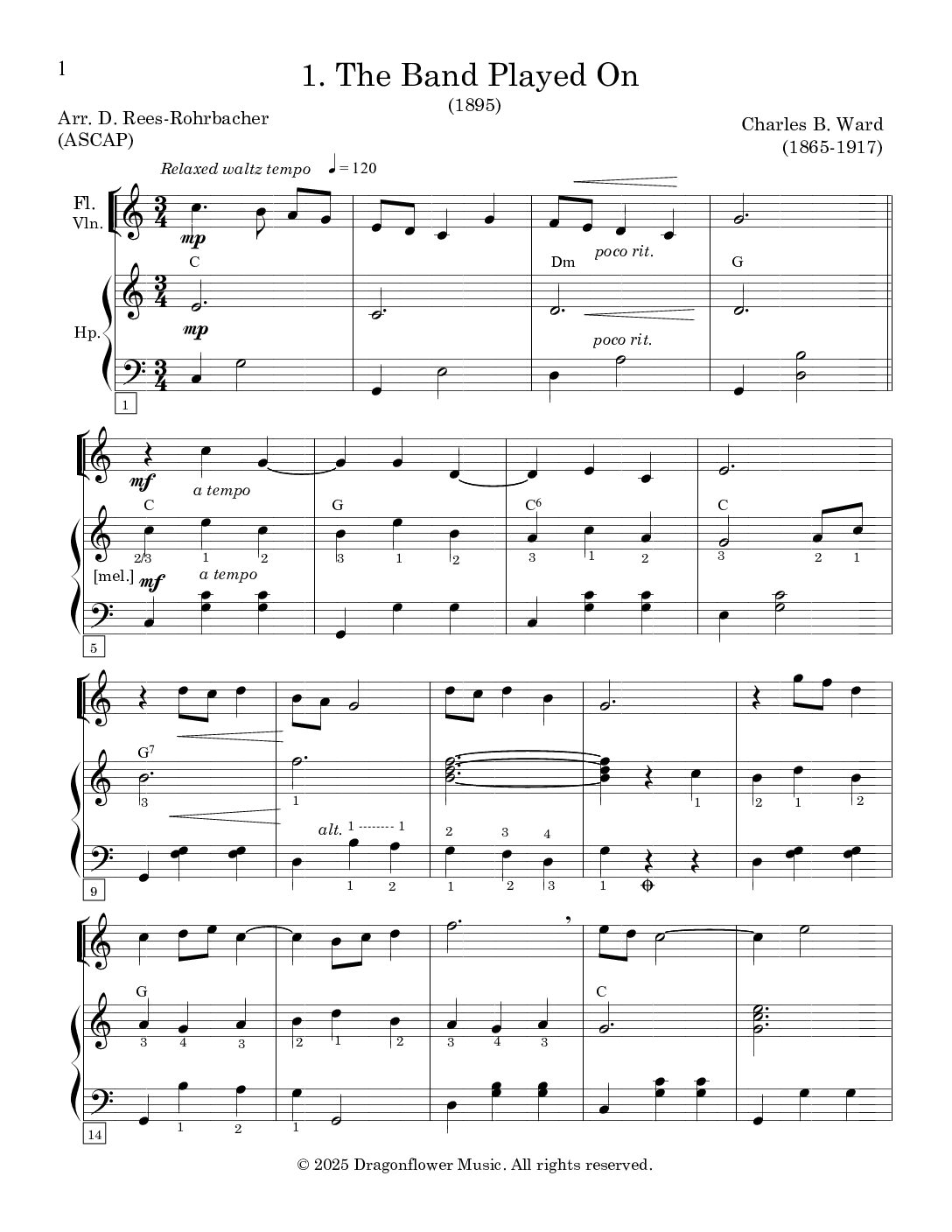 This collection of waltz songs is arranged in progressive key order (1) to facilitate movement from one key to the other and (2) to support fluid lever or pedal changes. (Lever changes are indicated between the grand staff and pedal changes are indicated below the bass staff.)