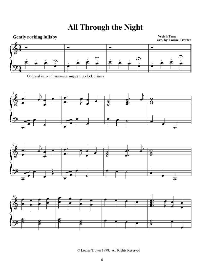 This is one of Ms. Trotter’s best selling arrangements. Easy to intermediate, all harps. Lovely tunes with harpistic qualities. These two pieces are instantly recognizable, great additions to repertoire. All Through the Night is suitable for use all year round.