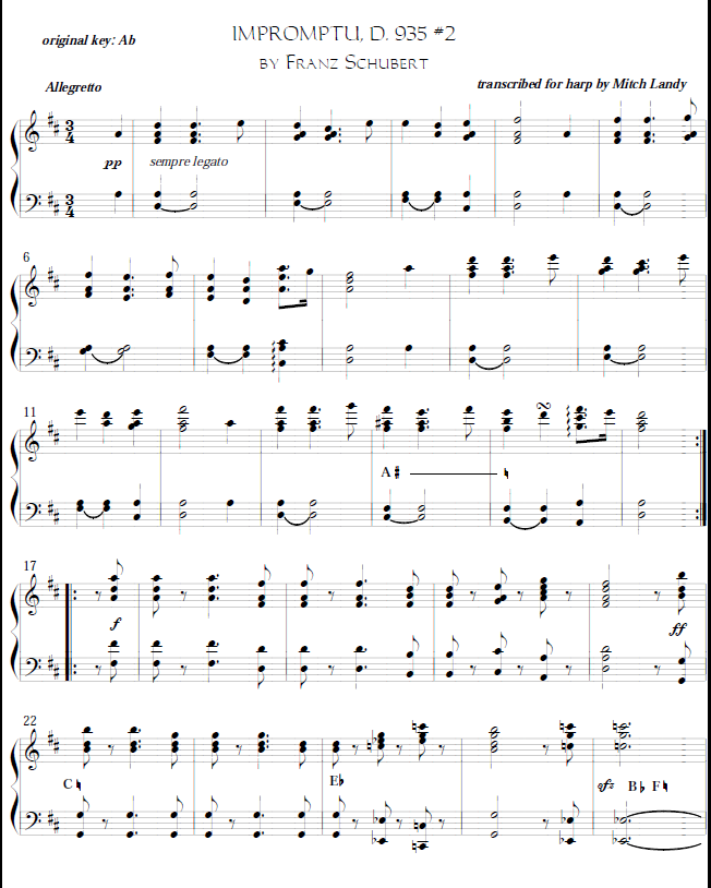 Numerous pedal shifts earn this piece an advanced intermediate rating. Rhythms are not complex but good technique will be required for clean playing and pedaling. Fingerings are not marked, but the original dynamic indications are preserved and clearly marked. This one would make a nice recital piece for someone wanting a different sort of addition to their repertoire. 7 pages, Key of D, with Trio section in G, transposed from original key of A flat. UPPER INTERMEDIATE, PEDAL HARP