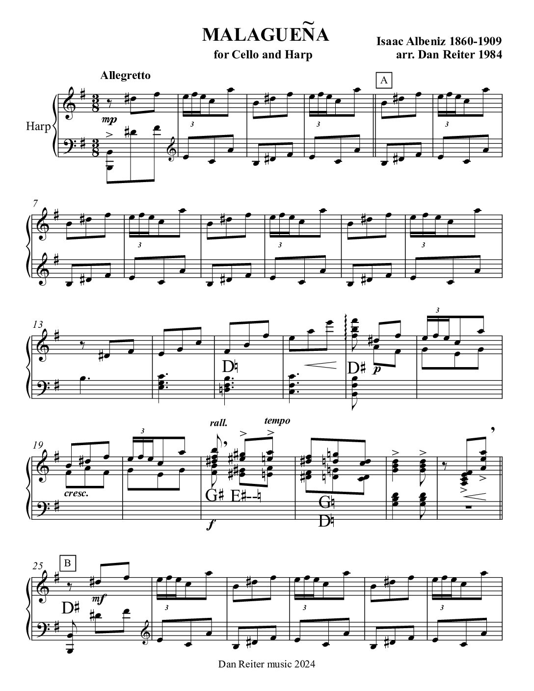 Immerse yourself in the evocative melodies of “Malagueña from España Op. 165 no. 3,” a timeless piece composed by Isaac Albéniz and masterfully arranged for flute, harp, and cello by Dan Reiter. This exquisite arrangement transforms the original Spanish dance into a rich, harmonious experience that captures the vibrancy and elegance of Andalusian culture. The interplay between flute, harp, and cello creates a dynamic and lush soundscape, making it a stunning addition to any performance or repertoire. Perfect for chamber ensembles and lovers of classical Spanish music, this arrangement showcases the beauty of Albéniz’s work through the lens of Reiter’s artistic vision. A must-have for musicians seeking a unique and captivating piece.