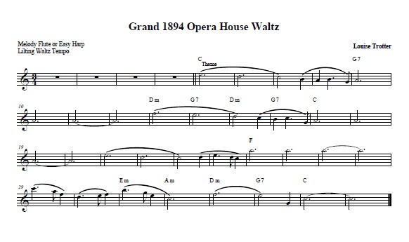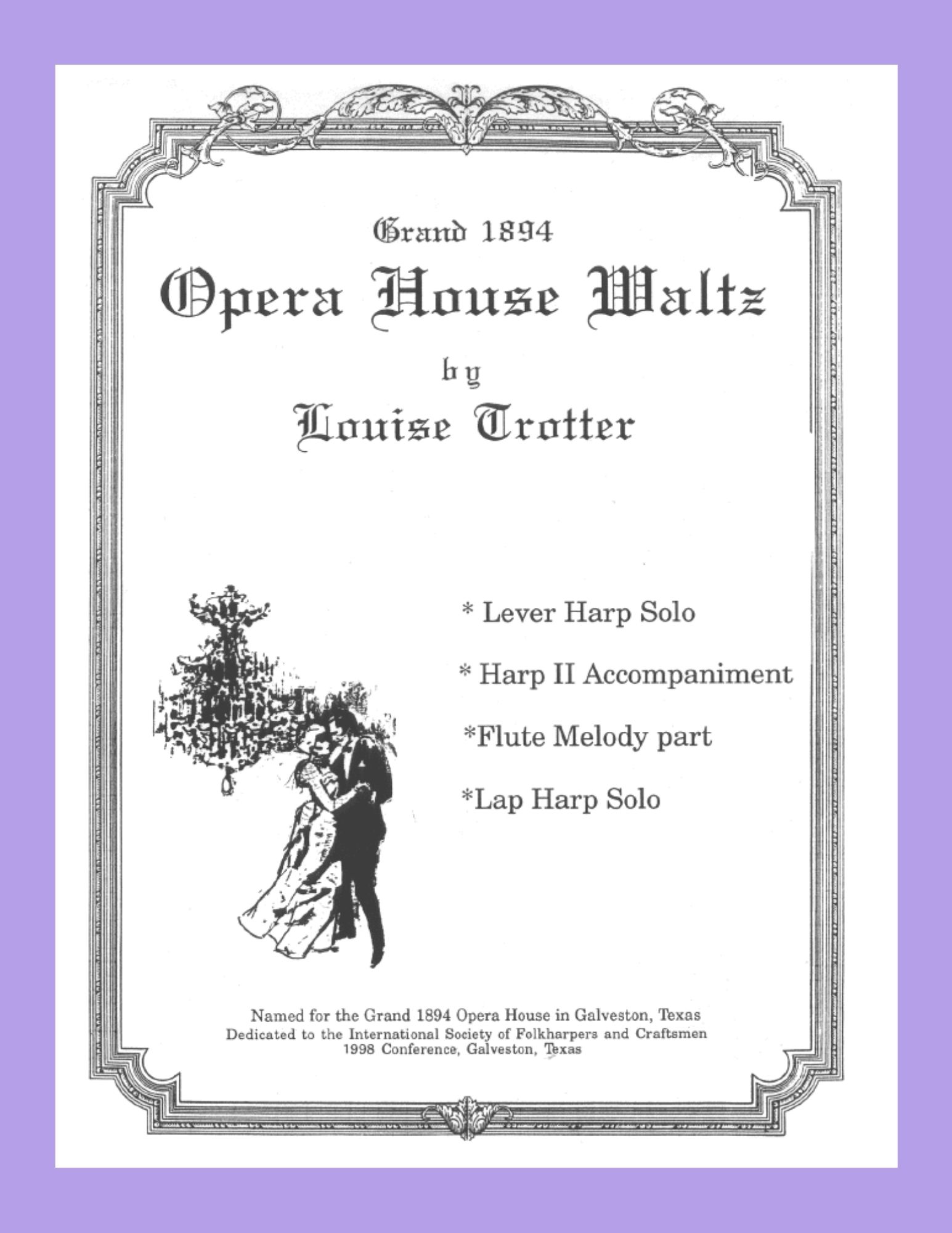 Louise was inspired to write this lovely tune by the Grand 1894 Opera House in Galveston, Texas. The 1998 ISFHC conference held most of its major concerts there. Key of C, left hand crossovers, and glisses to depict visions of fashionable couples dancing at grand balls during the turn of the century. In addition to the lever harp solo, there is a Harp II accompaniment part, a flute melody part, and an arrangement for lap harp solo. EASY, ALL HARPS.