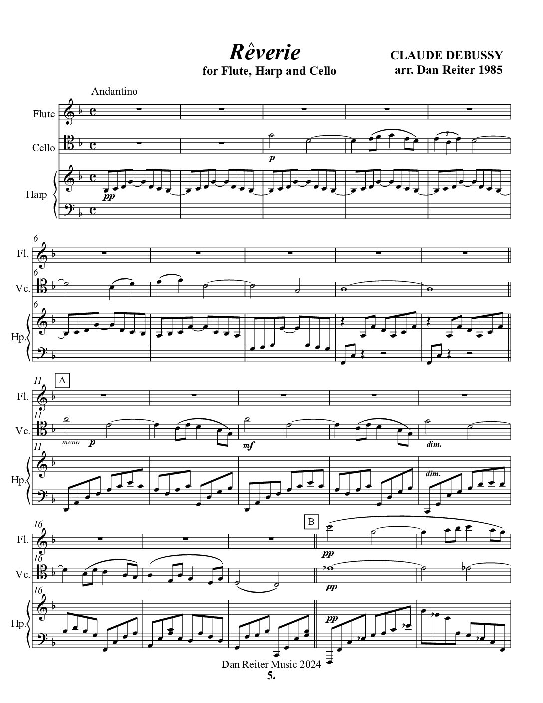 Dan Reiter’s arrangement of “Rêverie” by Claude Debussy for harp, flute, and cello is a delicate and enchanting adaptation of this beloved piece. This arrangement beautifully captures the serene and introspective nature of Debussy’s original composition, allowing each instrument to shine while blending harmoniously.