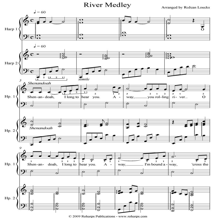 This medley combines American folk/spiritual favorites Shenandoah and Deep River. Lyrics are included, if performers or audience wish to sing along. It was arranged for the Prairie Winds Harp Ensemble and performed at the Smoky Hill River Festival in Salina, KS.