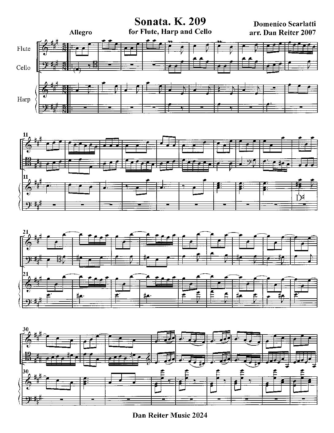 Greetings fellow musicians and fans of Domenico Scarlatti. This piece is one of seven Scarlatti sonatas for harpsichord arranged by Dan Reiter for a trio of flute, harp, and cello.