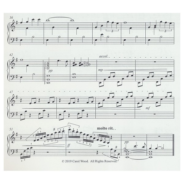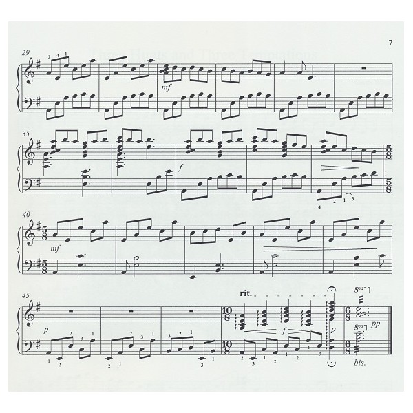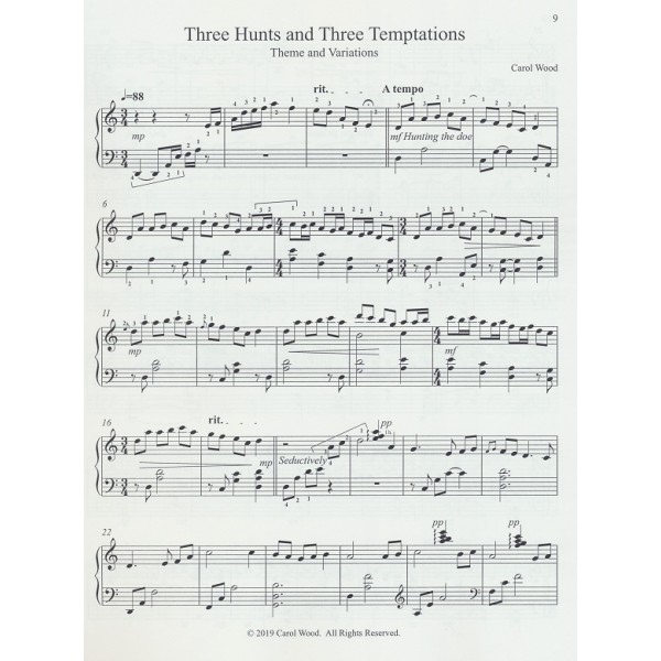 Only one piece is written in the key of G. The rest are key of C. No accidentals, busy left hand, tempo changes in some selections. Beginning tempo marks and fingerings are suggestions only; numbers below the notes indicate fingerings for left hand, and those above are for right hand. 17 pages.