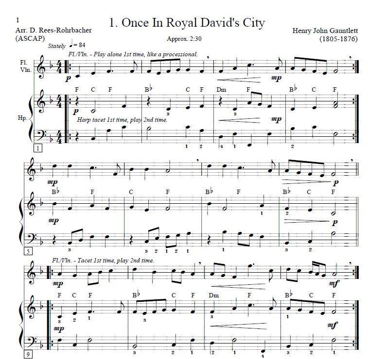 “The Christmas carols used in this publication have been arranged for melody instrument with harp accompaniment (lever or pedal).  However, there is quite a bit of interplay between the two instruments as well as some solo sections for each of them.  So, this is more than just a melody plus accompaniment book.
