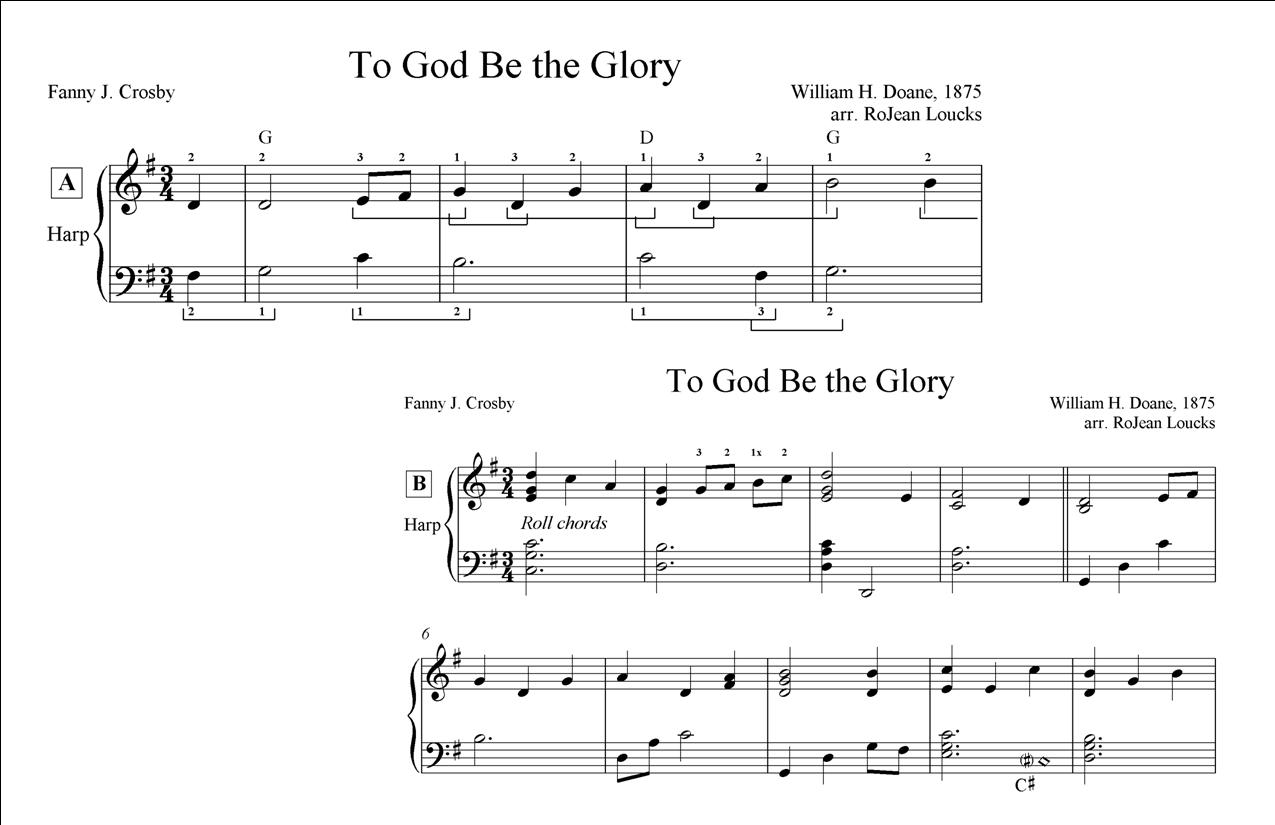 ALL HARPS SOLO, LATE BEGINNER/INTERMEDIATE. This piece is a single from Praise V2. A well-known hymn arranged by RoJean Loucks for solo lever or pedal harp in two different options – one for small harps and one for larger harps. Available as a PDF download only.