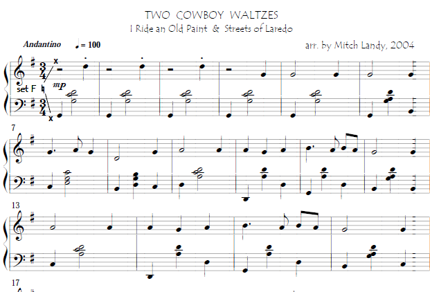 I Ride an Old Paint & Streets of Laredo seem to go together naturally. Starts in G, modulates to C, a very relaxed feeling in these tunes, with harmonics and some left hand crossovers, very nice harmonies, intermediate. Full range lever or pedal. INTERMEDIATE LEVER OR PEDAL