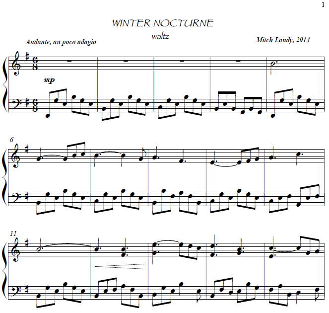 5 pages, key of Em, 6/8 time. Left hand has a moving line of consistent 8th notes, right hand goes back and forth with eighths, quarters, and toward the end, 16ths like snowfall. Beautiful piece!